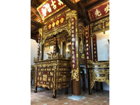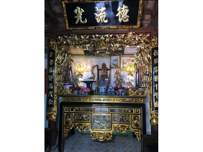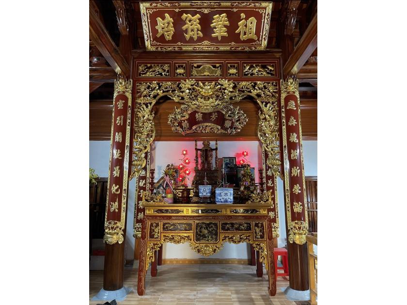 Tại không gian thờ cúng, bức hoành phi được treo cao nhất, hơi nghiêng về phía trước để người nhìn dễ quan sát và tạo sự cân đối trong bàn thờ.