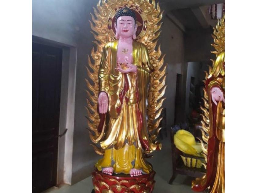 Tượng A Di Đà đứng là hình ảnh Ngài đứng trên đài sen, thân khoác áo cà sa đỏ hoặc vàng chạm tới đất, vát chéo vạt áo và để lộ ngực của mình với chữ “Vạn”, đôi mắt nhìn xuống, tay trái bắt ấn thiền định và tay phải duỗi xuống dưới mang ý nghĩa luôn sẵn sàng chờ đợi cứu vớt những người đang rơi vào vòng luẩn quẩn luân hồi.