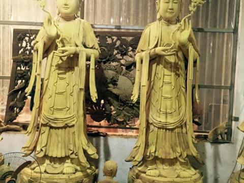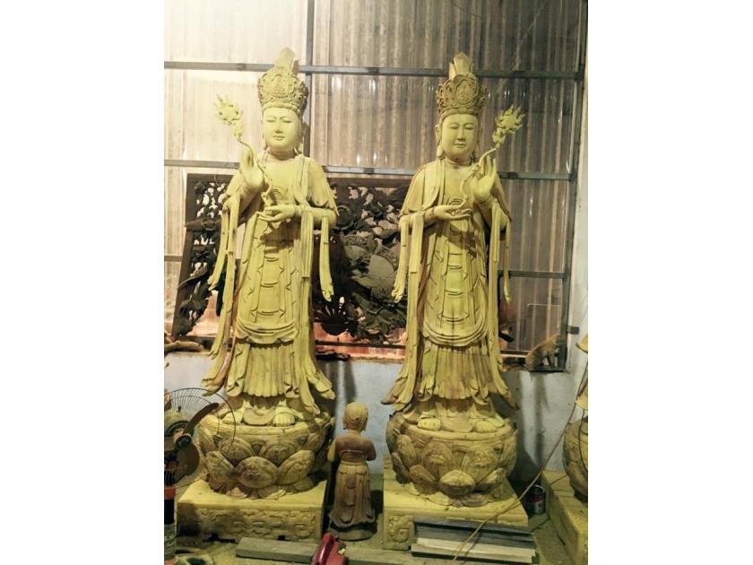 - Với tượng đặt, thường sử dụng gỗ mít lõi qua các bước ghép thô, phát dáng và đục chi tiết.